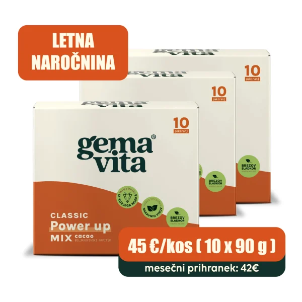 Power up MIX – Classic je beljakovinski obrok za hiter zajtrk ali malico. Sestavljen iz beljakovin kozje sirotke in dehidriranimi ter mletimi sestavinami, kot so kakav, oreščki, acerola, kokosova voda,… S širokim spektrom mikrohranil iz naravnih virov.
